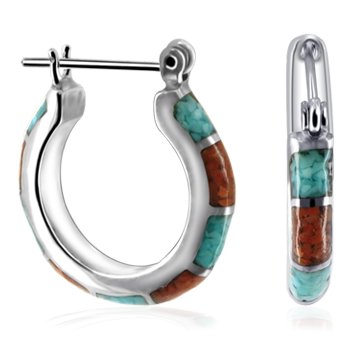 @@@ Product Details : TBES056 Turquoise and Coral Sterling Silver 0.5" Wide Huggies Hoop Earrings